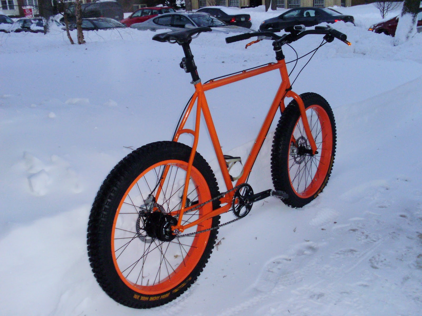 I just repainted and rebuilt my Surly 1×1 for some easier winter riding. The bike was orange, but I couldn’t match their color to paint the rims, so I just found a new orange to paint it with. It’s pretty fun to ride around in the snow, a little heavy, but I’ve resigned myself to not going super fast on it. The bright orange will hopefully help me be seen!